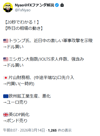 「ファンダの勉強してるけど どうやってトレードに 活かせばいいか分からない」 とお悩みの方へ。 ご安心ください。 私、Nyaoが、 普段のトレードで ファンダを使って どのように 利益を生み出しているのか? そのトレード手法を 簡単に!わかりやすく! 解説することにしました! 詳しくはこちらから! ※その他、YouTubeメンバーシップへの登録はこちらから